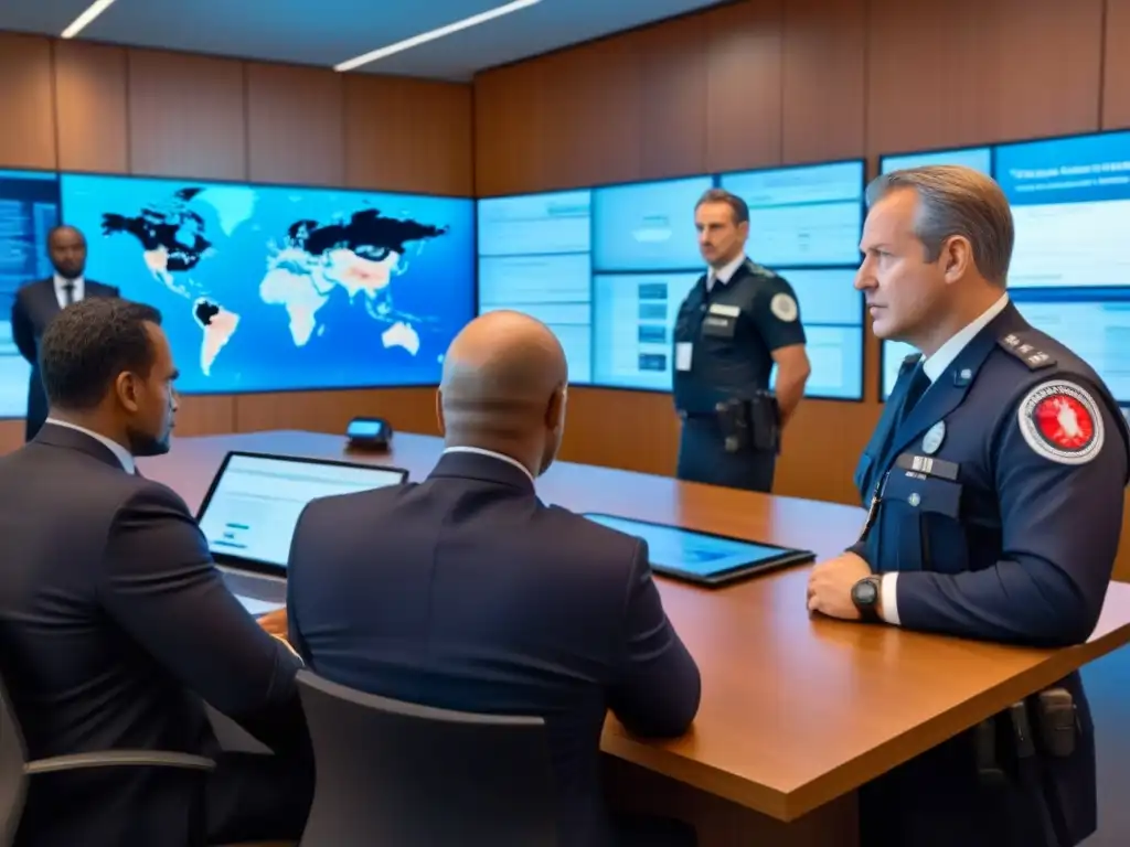 Intensa reunión internacional de expertos en seguridad debatiendo reforma de seguridad pública internacional en moderna sala de conferencias