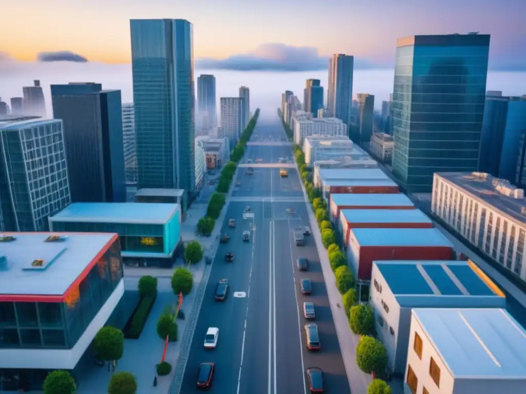 Vista aérea de ciudad vibrante con rascacielos y calles llenas, capturada por un dron
